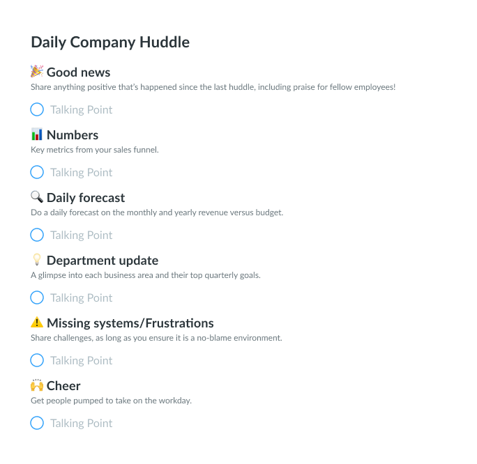 Get this templateKeep your teams aligned and productive with our Daily Huddle Meeting Template curated by Cameron Herold, founder of the COO Alliance and author of “Meetings Suck”. Perfect for team leaders, this template helps facilitate quick and effective meetings. Use this template in Fellow to add talking points, link relevant tickets, and track action items.