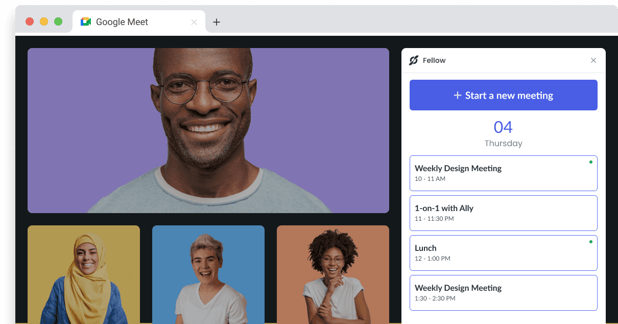 Fellow’s Chrome extension makes it easy to find and edit your meeting agendas by bringing your notes right inside of Google Meet and providing quick access via your Google Calendar.